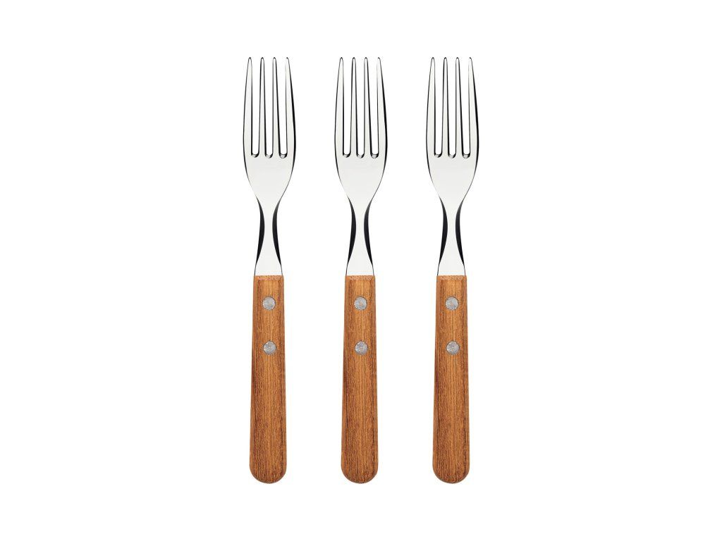 Set príborových vidličiek zo série Dynamic z dielne brazílskej značky Tramontina pozostáva z 3 kusov príborových vidličiek. Čepeľ je vyrobená z nehrdzavejúcej ocele. Rukoväte sú vyrobené z prírodného dreva a sú pripevnené hliníkovými nitmi. Dizajn jednotlivých produktov dodá Vášmu stolovaniu rustikálny vzhľad. V našej ponuke nájdete aj sety nožov a lyžíc, tak si môžete ľahko vyskladať príborový set aký Vám vyhovuje.