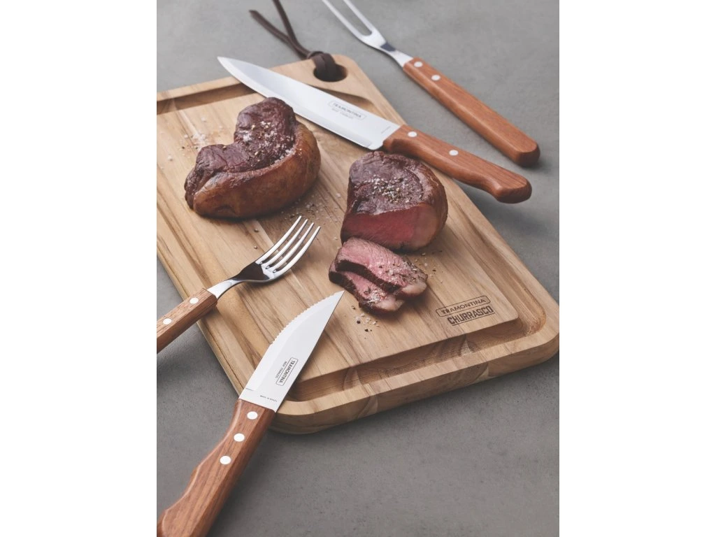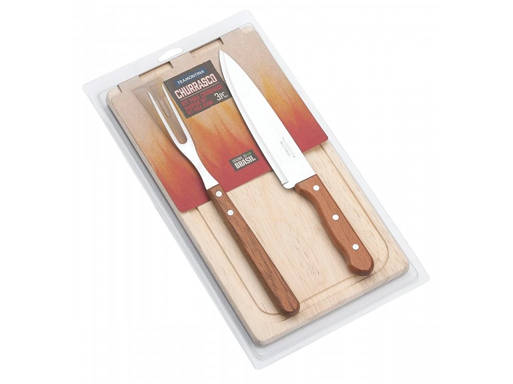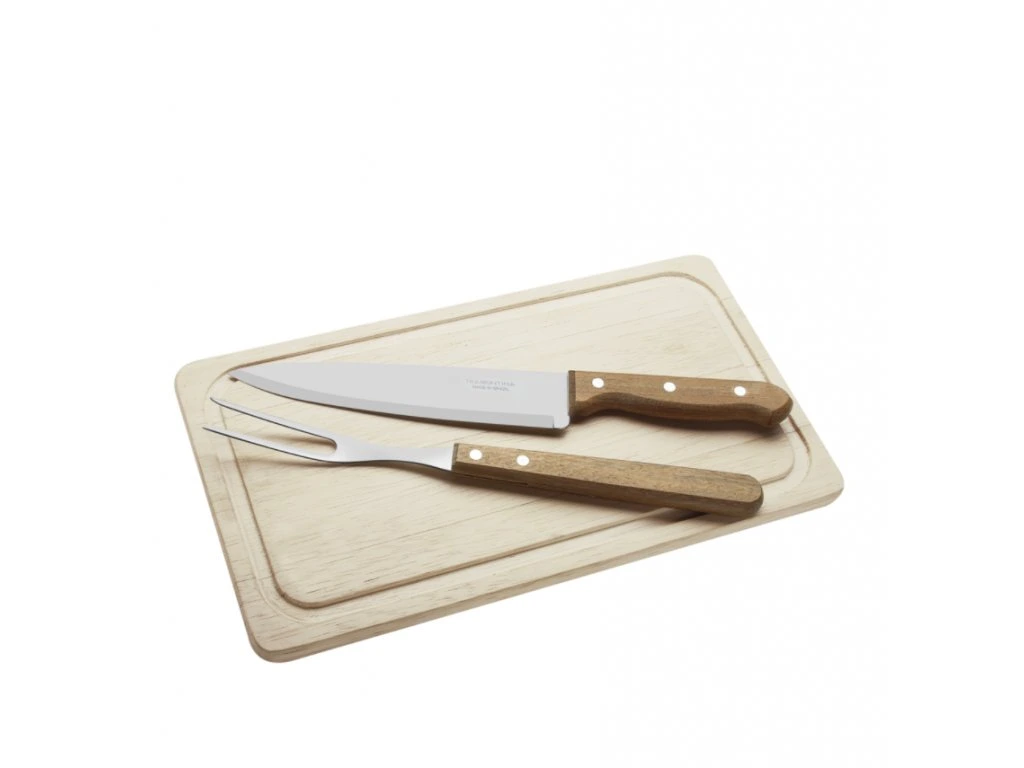 Set na servírovanie z prírodného dreva je zo série Dynamic z dielne brazílskej značky Tramontina. Set pozostáva z troch najnevyhnutnejších servírovacích pomocníkov na grilovačkách - vidlice, noža na mäso a drevenej dosky na krájanie. Čepeľ noža je vyrobená z tepelne upravenej nehrdzavejúcej ocele, vďaka čomu je jeho rezná hrana dlhodobo ostrá. Rukoväte sú vyrobené z prírodného dreva a sú pripevnené hliníkovými nitmi. Servírovací set je špeciálne navrhnutý pre pohodlné rezanie steakov a iných druhov mäsa, takže ho určite oceníte Vy aj Vaši hostia na záhradných grilovačkách. Dizajn jednotlivých produktov dodá Vášmu stolovaniu rustikálny vzhľad. Odporúčame ručné umývanie, nevhodné do umývačky riadu.