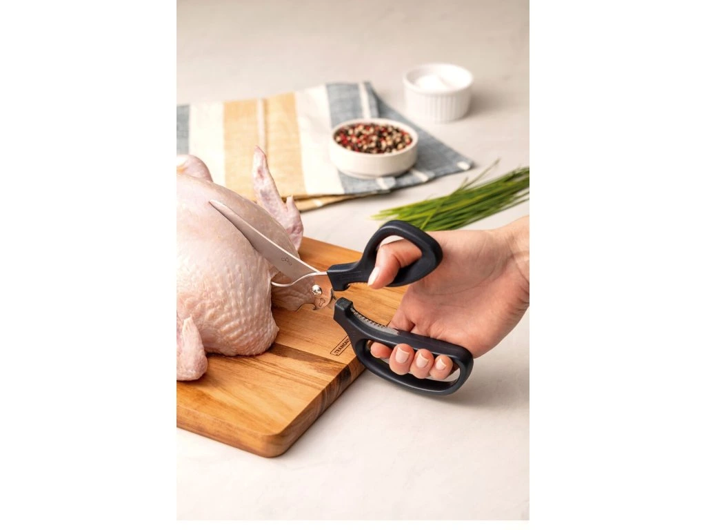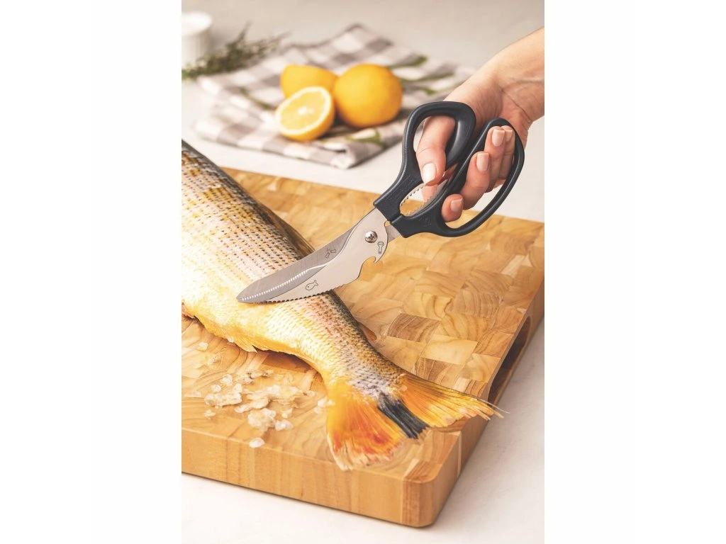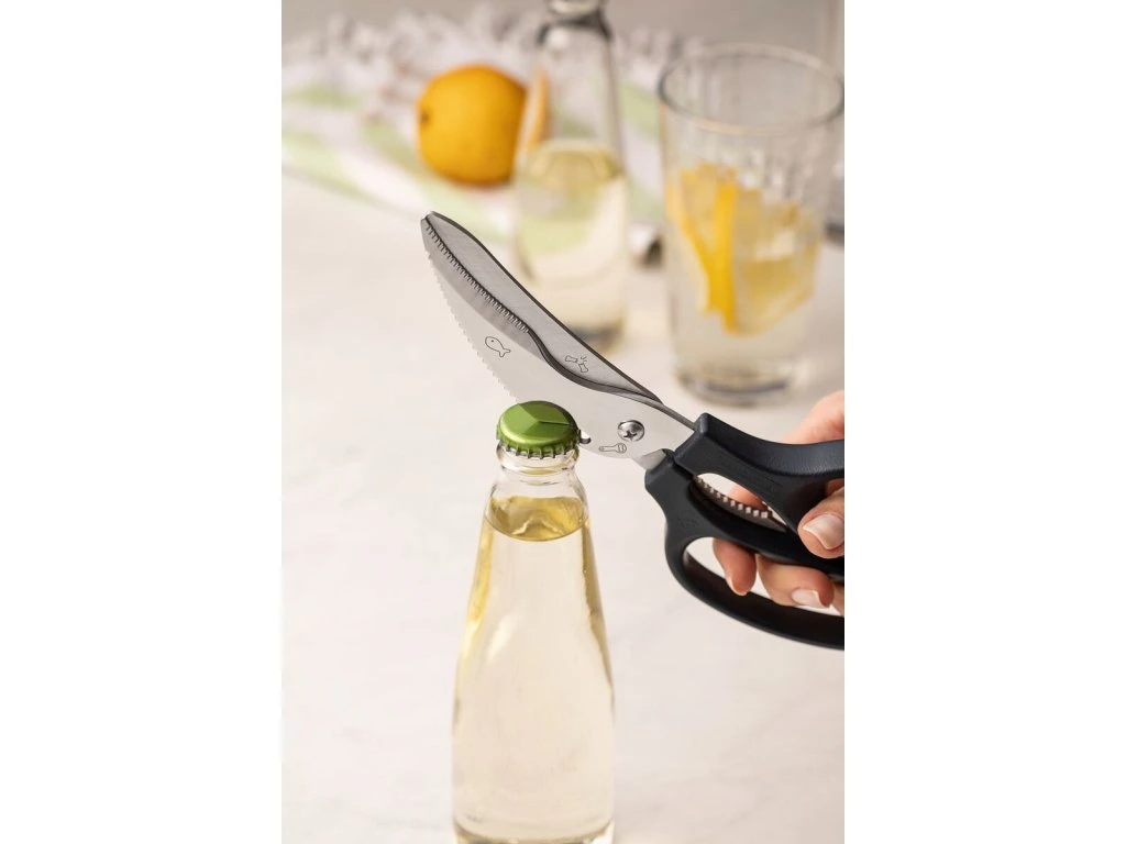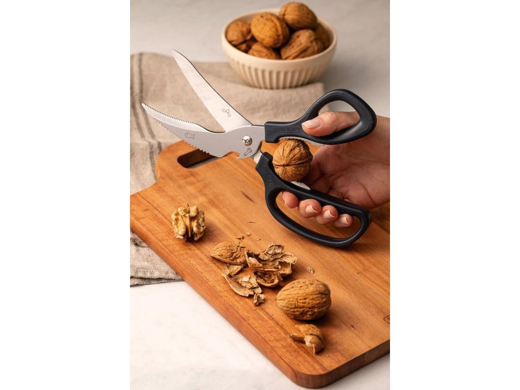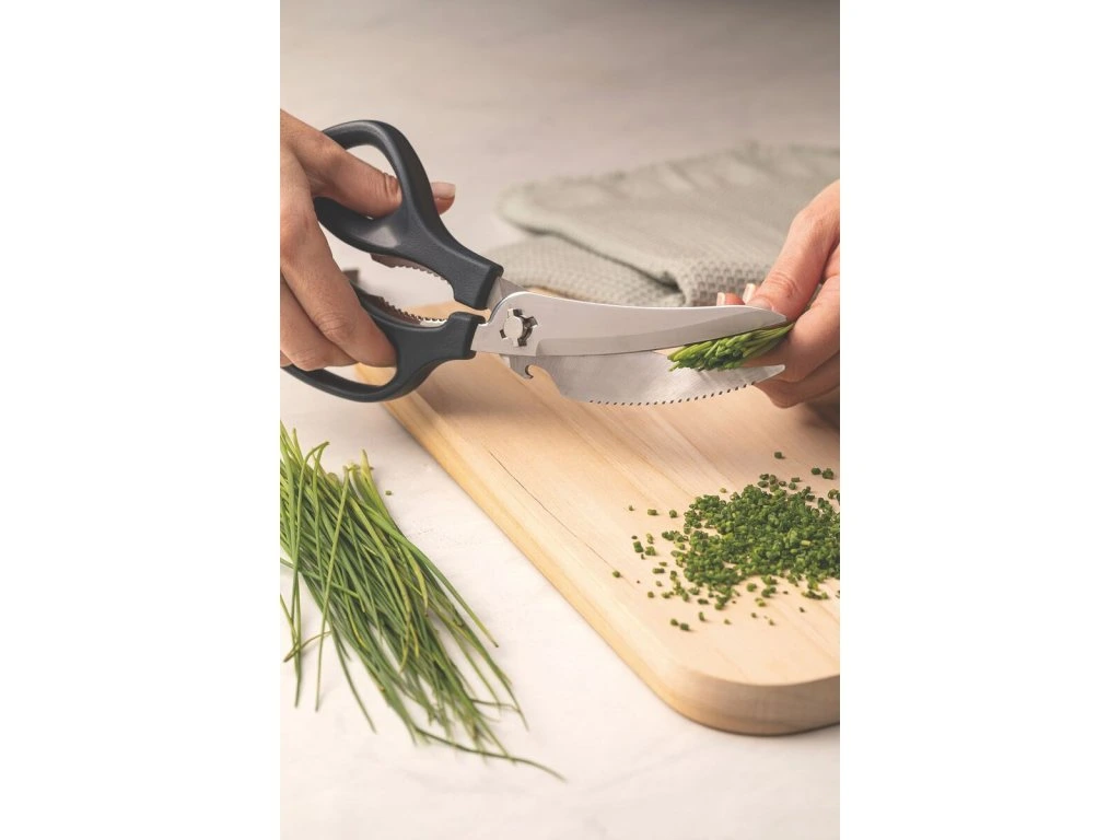 Multifunkčné nožnice 4v1 z kolekcie Supercort z dielne brazílskeho výrobcu Tramontina sú univerzálnym a praktickým pomocníkom do každej kuchyne. Strihanie hydiny, čistenie rýb, lúskanie orechov či otvorenie obľúbeného nápoja sú odteraz jednoduchšie ako ste si mysleli. Čepeľ z nehrdzavejúcej ocele, ergonomicky tvarovaná polypropylénová rukoväť, ľahké čistenie a príjemný dizajn v šedom prevedení - to sú kuchynské multifunkčné nožnice od Tramontiny.