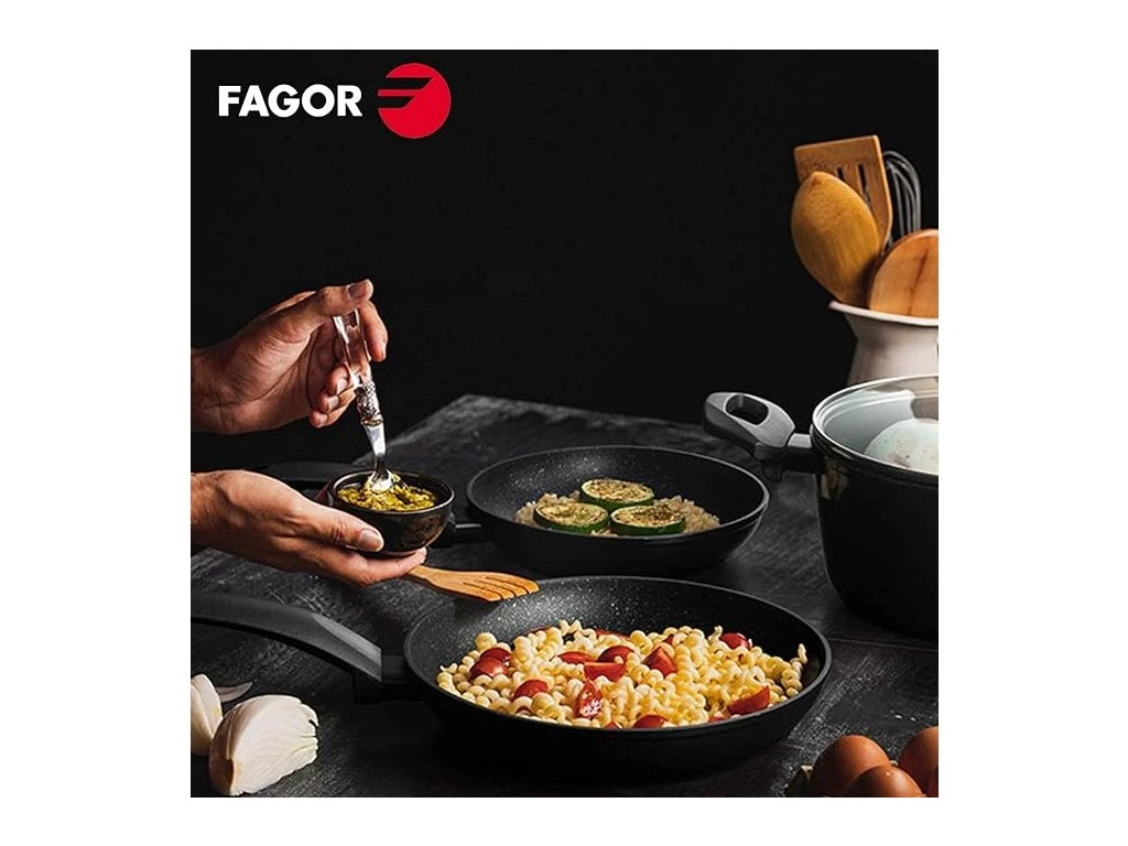 Panvica s priemerom 24 cm od španielskeho výrobcu Fagor je vyrobená z kovaného hliníka, ktorý ideálne rozvádza teplo po celej ploche, čím sa efektívne využije energia a rovnomerné varenie potravín. Vnútorná plocha je potiahnutá nepriľnavou vrstvou Xylan Plus Double Layer, ktorá zabraňuje prichytávaniu jedla a uľahčuje čistenie. Vnútorný povrch má vzhľad pripomínajúci kameň. Neobsahuje PFOA ani ťažké kovy. Vhodná je na všetky typy sporákov vrátane indukcie. Rýchlo sa rozpáli, takže namiesto čakania kým sa panvica rozohreje môžete čas využiť oveľa efektívnejšie. Tento produkt má vynikajúci pomer ceny a kvality. Veľmi ľahko sa čistí, stačí ju prejsť vlhkou handričkou.