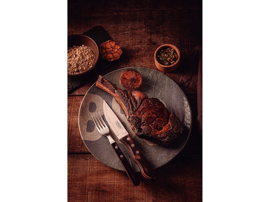 Nôže Jumbo na steak s hnedou rukoväťou z línie Polywood Churrasco z dielne brazílskeho výrobcu Tramontina je vyrobená z nehrdzavejúcej ocele. Drevená rukoväť je upravená špeciálnou technológiou tak, že je odolná voči nárazom a vysokým teplotám, takže je vhodná aj do umývačky riadu. Tepelné ošetrenie dodáva čepele trvácnosť. Drevená rukoväť s polypropylénovou úpravou pripevnená hliníkovými nitmi sa pohodlne používa. Maximálne ostrá čepeľ so zúbkami si poradí s každým kúskom mäsa. Tovar vhodný pre Horeca aj pre domácnosť.
