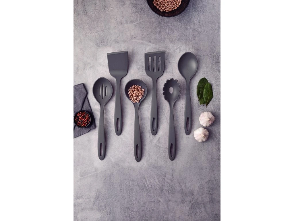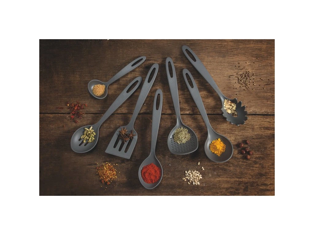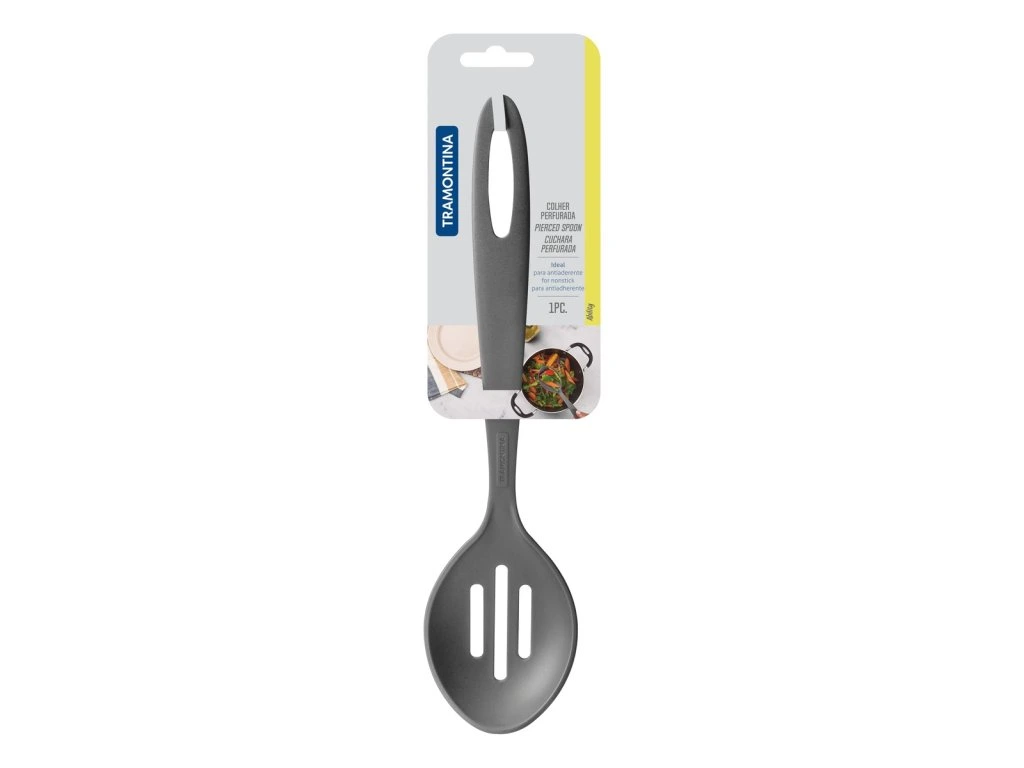Servírovacia lyžica s otvormi v modernej grafitovej sivej farbe zo série Ability od brazílskej značky Tramontina sa stane Vašim nevyhnutným pomocníkom v kuchyni. Servírovacia lyžica s otvormi je vyrobená z vysokokvalitného termoplastu - nylonu, ktorý je vhodný pre použitie pri tepelnej úprave jedál do 180°C. Môžete ju použiť na akýkoľvek povrch panvíc, hrncov či iných nádob bez obavy z poškriabania. Séria Ability okrem servírovacej lyžice ponúka aj široký výber iného kuchynského náčinia z termoplastu ako napríklad špachtle, naberačky, napeňovačky, lopatky na tortu, nôž na koláče a mnohé iné. Všetky sa ľahko čistia a sú vhodné do umývačky riadu.