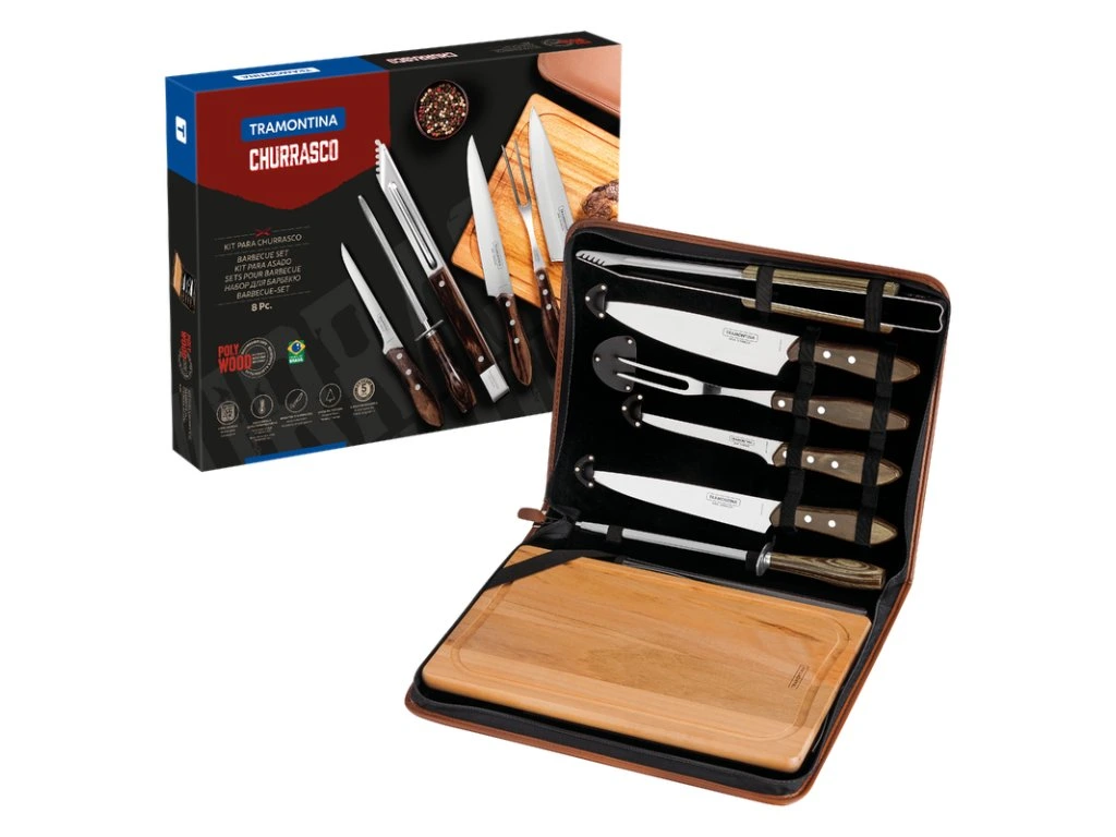 Príborový set na grilovanie od Tramontina v luxusnom drevenom obale je atraktívny doplnok vašej grilovačky, ale aj exkluzívny darček. Najpoužívanejšie nože rôznych rozmerov z najkvalitnejšej nehrdzavejúcej ocele a ergonomicky tvarované drevené rukoväte sú stvorené pre bežné používanie, ale aj pre servírovanie vašej obľúbenej grilovanej pochutiny. Ostré čepele zabezpečujú perfektný rez a špeciálna povrchová úprava červenej drevenej rukoväte pevnosť a odolnosť voči vysokým teplotám. Preto sú tieto produkty vhodné do umývačky riadu. Sada obsahuje všetky potrebné pomôcky na grilovanie. Zabalené v darčekovom balení.