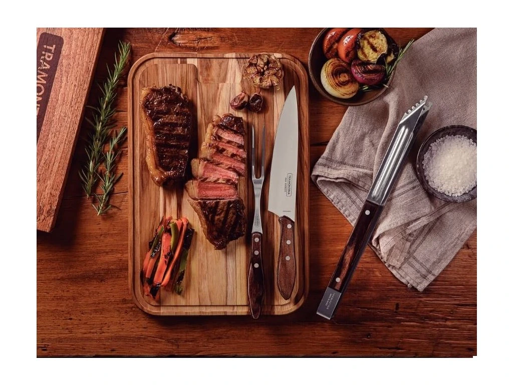 Set na servírovanie Tramontina Polywood- 3ks - hnedý premení obyčajné servírovnie grilovaných špecialít na štýlové a profesionálne. Čepele z nehrdzavejúcej ocele a hnedé polywoodové rukoväte, to je set Polywood Churrasco od značky Tramontina. rukoväte s nitmi z nehrdzavejúcej ocele, zaručujú väčšiu trvácnosť a odolnosť. Oceľ, z ktorej je set vyrobený, prechádza špeciálnym tepelným opracovaním vo vysokých teplotách, aby bolo náradie odolnejšie a malo vyššiu reznú silu. Náradie je vhodné na umývanie v umývačke riadu.