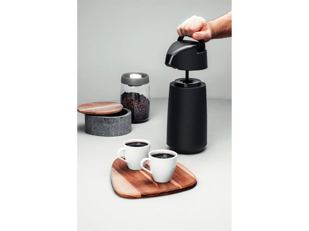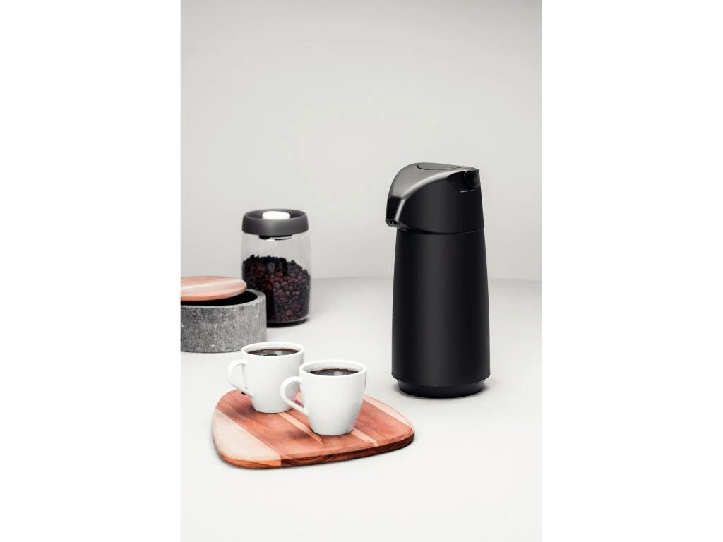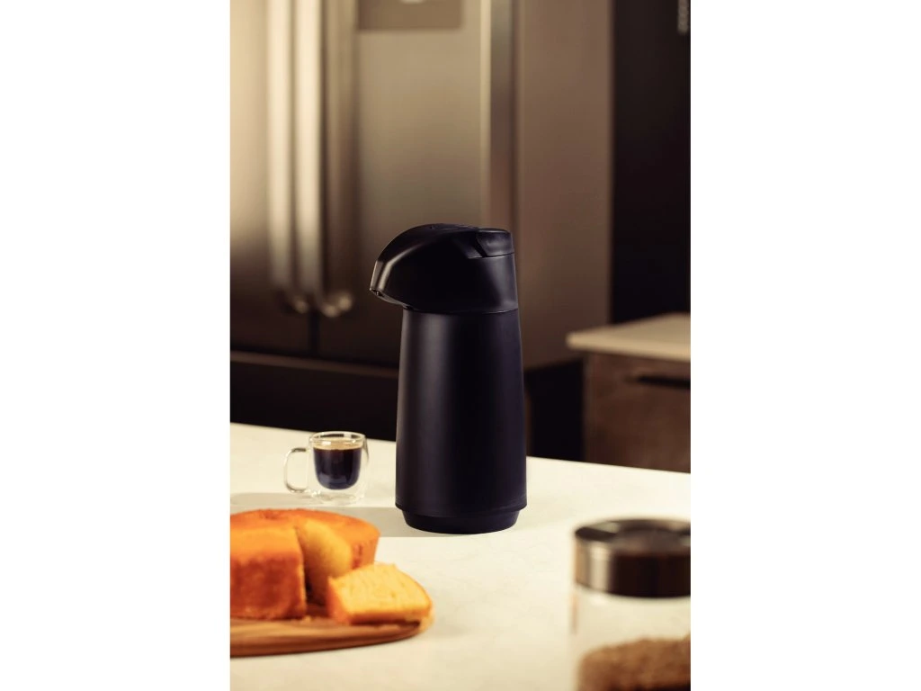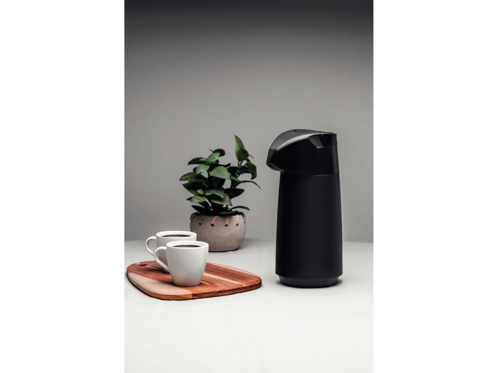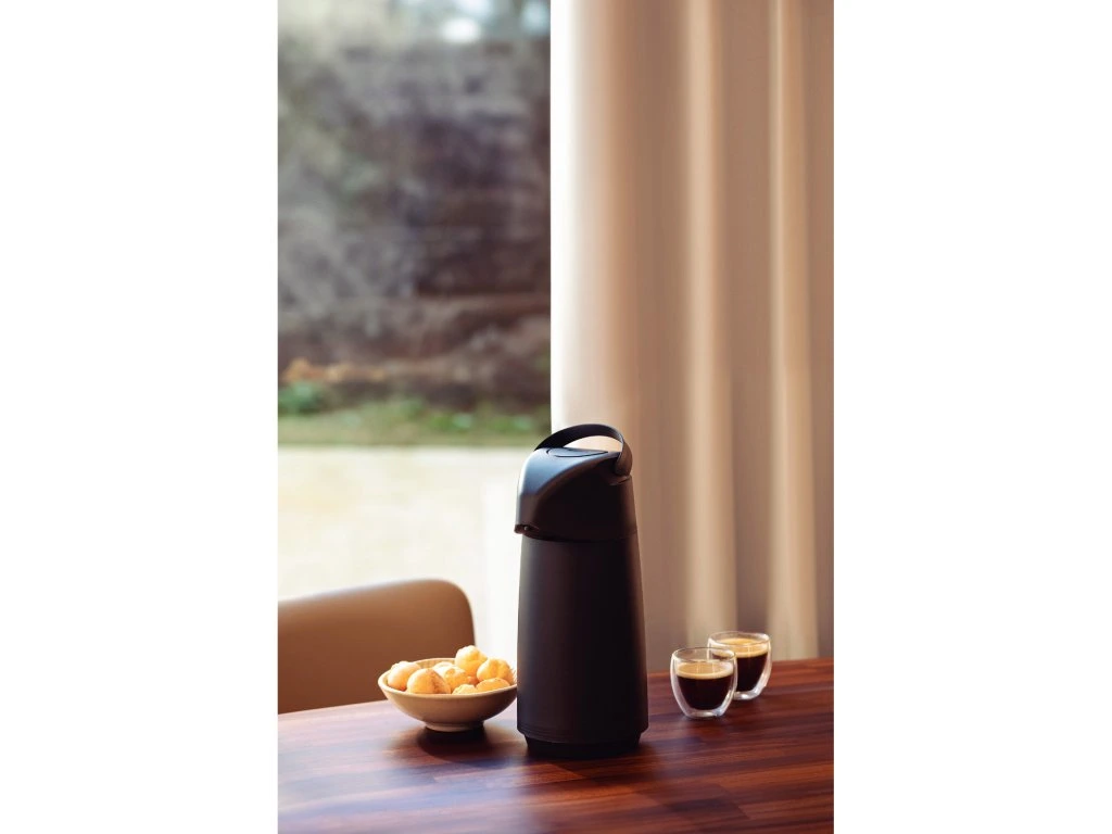 Termoska s pumpou z kolekcie Exata z dielne brazílskej značky Tramontina má objem 1 liter. Vyrobená je z kvalitného polypropylénu a sklenenej vnútornej vložky. Vyznačuje sa ľahkou manipuláciou a nadčasovým dizajnom. Výsuvná rukoväť je praktická pre uchopenie a prenášanie termosky. Odkvapkávací systém zabraňuje nežiaducemu odkvapkávaniu po podávaní. Tento produkt ani jeho komponenty neobsahujú BPA, preto je bezpečný pre celú rodinu. Je hygienická a ľahko sa čistí. Okrem teplých nápojov je vhodná aj pre studené nápoje, kedy udrží ich chlad až 12 hodín.